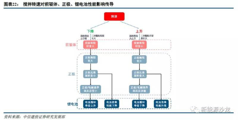 攪拌速度對(duì)前驅(qū)體、正極、鋰電池性能影響傳導(dǎo)主要通過影響顆粒形貌。攪拌速度過低會(huì)導(dǎo)致前驅(qū)體晶體生長過快,球形度變差,材料間空隙變多,從而導(dǎo)致前驅(qū)體比表面積過大;攪拌速度過高會(huì)導(dǎo)致前驅(qū)體團(tuán)聚體中的一次顆粒過大,造成材料間空隙變多,從而導(dǎo)致前驅(qū)體比表面積過大。前驅(qū)體比表面過大,將導(dǎo)致正極振實(shí)、壓實(shí)密度下降,鋰電池能量密度下降,同時(shí)正極材料與電解液界面反應(yīng)加劇,電池循環(huán)壽命下降;另一方面由于空隙變多,鋰離子傳輸通道變多,電池倍率性能提升。