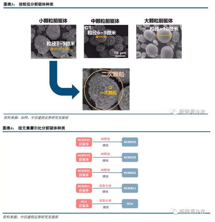 三元前驅(qū)體的生產(chǎn)具有高度定制化的特點(diǎn),其元素配比、形貌、粒徑等組合不一。按粒徑大小分,前驅(qū)體可分為小顆粒前驅(qū)體、中顆粒前驅(qū)體、大顆粒前驅(qū)體,一般小顆粒前驅(qū)體粒徑分布在3~5微米,由于其在混鋰燒結(jié)步驟所需溫度相對(duì)較低,出于成本角度考慮多用于制作需要燒結(jié)溫度更高的單晶型三元正極材料(相同元素配比、粒徑大小,單晶三元正極燒結(jié)溫度比普通型要高100~200度);中顆粒前驅(qū)體一般在6~8微米;大顆粒前驅(qū)體粒徑一般在10微米以上,其混鋰燒結(jié)步驟所需溫度更高,出于成本角度考慮一般用于制作多晶/二次球三元正極材料。按元素摩爾比分,前驅(qū)體可分為111型、523型、622型、811型以及NCA型,或高鎳型、低鎳型。
