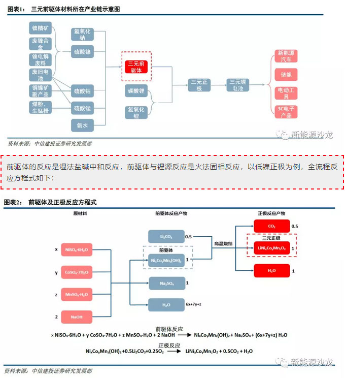 三元前驅(qū)體材料是鎳鈷錳氫氧化物,化學(xué)式為NixCoyMn(1-x-y)(OH)2,是生產(chǎn)三元正極材料的重要上游材料,通過與鋰源(NCM333、NCM523、NCM622用碳酸鋰,NCM811、NCA用氫氧化鋰)混合后燒結(jié)制得三元正極成品。三元正極材料是制作鋰電池的關(guān)鍵性材料之一,其終端下游包括新能源汽車、儲(chǔ)能、電動(dòng)工具以及3C電子產(chǎn)品等。