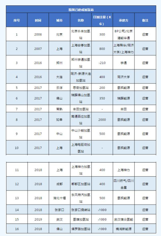 據(jù)不完全統(tǒng)計(jì),截至2018年12月,中國共有27座建成的加氫站,其中3座已被拆除,部分尚未運(yùn)營。由數(shù)據(jù)顯示,日加氫量在200kg到1000kg之間不等,值得一提的是,上海氫楓能源技術(shù)有限公司獨(dú)立承建且運(yùn)營狀態(tài)的加氫站有5座。據(jù)小編了解,除表中提到的參與建設(shè)加氫站的企業(yè)還有億華通、美錦能源、三環(huán)集團(tuán)、雪人股份等。
