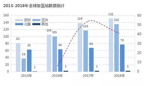 隨著各國氫能源汽車的推廣,全球主要國家將加快加氫站建設(shè)。由Ludwig-B?lkow-Systemtechnik (LBST) 和 TüV SüD共同運(yùn)營的H2stations.org網(wǎng)站發(fā)布的全球加氫站年度評估報(bào)告中顯示,2015-2018年保持增速發(fā)展,至2018年全球加氫站較17年底新增48座,截止到2018年底,全球加氫站數(shù)目達(dá)到369座,其中有273座對外開放,可以像任何傳統(tǒng)的零售站一樣使用;其余的站點(diǎn)則為封閉用戶群提供服務(wù),比如公共汽車或車隊(duì)用戶。