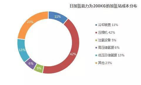 現(xiàn)階段加氫站建設(shè)最大的阻礙就是成本問題,目前我國一個日加氫能力為200kg的加氫站成本約為1000萬元左右,歐洲同等量級的加氫站所需成本約800-1000萬元。對于一個日加氫量為200kg的串級高壓儲氫加氫站,其成本分布如下: