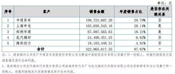 從客戶(hù)情況來(lái)看,報(bào)告期內(nèi),億華通前五大客戶(hù)為中通客車(chē)、上海申龍、鄭州宇通、北汽福田、濰柴動(dòng)力,合計(jì)年度銷(xiāo)售占比達(dá)87.67%。