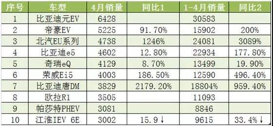 其中,銷(xiāo)量前10企業(yè)4月累計(jì)銷(xiāo)售新能源乘用車(chē)7.06萬(wàn)輛,占當(dāng)月新能源乘用車(chē)總銷(xiāo)量的77%,占比近8成。比亞迪繼續(xù)以2.27萬(wàn)輛獨(dú)占鰲頭,其中元EV表現(xiàn)優(yōu)異,當(dāng)月銷(xiāo)售6428輛,位居新能源乘用車(chē)銷(xiāo)量榜首,2019年累計(jì)銷(xiāo)量超3萬(wàn)輛。