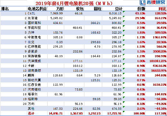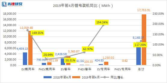 2、2019年前4月鋰電裝機(jī)17.76GWh,同比增長117.38%