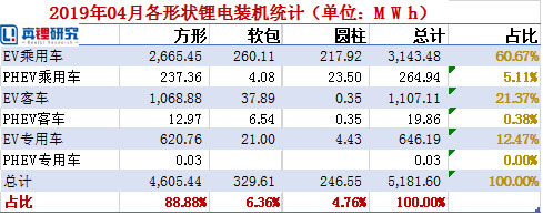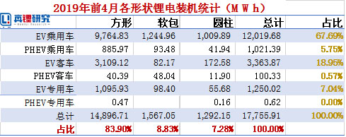 從各形狀鋰電裝機(jī)情況來看,2019年前4月17.76GWh的裝機(jī)量中,方形電池以14.90GWh裝機(jī)占比83.90%,軟包電池以1.57 GMWh裝機(jī)占比8.83%,圓柱電池以1.29GWh裝機(jī)占比7.28%。