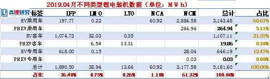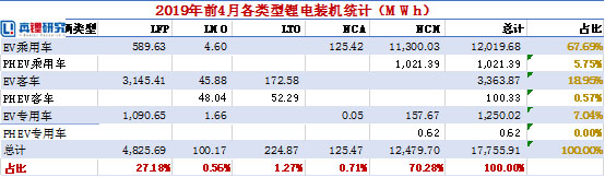 從各類型鋰電裝機(jī)情況來看,2019年前4月NCM的裝機(jī)量12.48GWh,占比70.28%,其中90.55%用在了EV乘用車市場(chǎng),在客車市場(chǎng)沒有應(yīng)用。磷酸鐵鋰電池(LFP)前4月實(shí)現(xiàn)裝機(jī)4.83GWh,占比27.18%,其中65.18%用在EV客車市場(chǎng)。