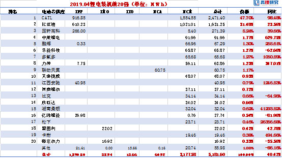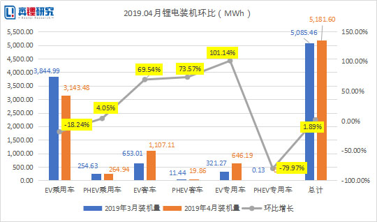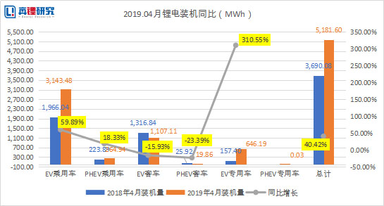 1、2019年4月鋰電裝機(jī)5.18GWh,同比增長40.42%,環(huán)比增長1.89%