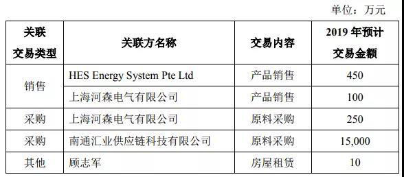 1、預(yù)計(jì) 2019 年公司將繼續(xù)為 HES Energy System Pte Ltd 提供產(chǎn)品,銷售的產(chǎn)品主要為燃料電池電堆等,具體交易金額視雙方具體合同簽訂,預(yù)計(jì)不超過(guò) 450 萬(wàn);2、預(yù)計(jì) 2019 年本公司將繼續(xù)為上海河森電氣有限公司提供產(chǎn)品,銷售的產(chǎn)品主要燃料電池電堆等,具體交易金額視雙方具體合同簽訂,預(yù)計(jì)不超過(guò)100萬(wàn);