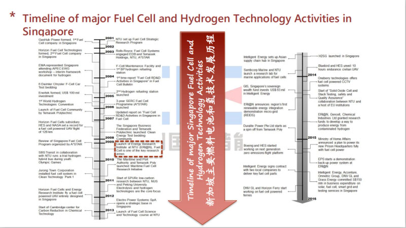 太陽能是一種間歇式能源,如何把它儲(chǔ)存起來呢?政府從1998年開始規(guī)劃了燃料電池和氫能的發(fā)展。南洋理工大學(xué)燃料電池實(shí)驗(yàn)室就是在這樣的背景下誕生的,1998年成立。一個(gè)課題組不足以完成所有的任務(wù),新加坡主要的燃料電池和氫能技術(shù)的發(fā)展歷程就在這張表上統(tǒng)計(jì)了。2009年為了進(jìn)一步綜合利用各種可再生能源,例如:太陽能、風(fēng)能、潮汐能等等。2009年在南洋理工大學(xué)成立了一個(gè)能源研究所。能源研究所成立之后,首先承擔(dān)了兩個(gè)旗艦項(xiàng)目,一個(gè)是生態(tài)校園,這個(gè)生態(tài)校園會(huì)充分利用太陽能。目前校園屋頂上的太陽能裝機(jī)容量是5兆瓦,將來要達(dá)到9.9兆瓦。這些能量能夠滿足大學(xué)7%-10%的能源使用。