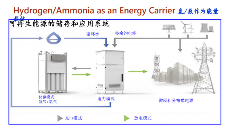 另外,這是新加坡可再生能源集成演示。大家有興趣的話,可以在YouTube上搜NTU REIDS - Renewable Energy Integration Demonstrator Singapore就可以看到我們這個(gè)項(xiàng)目是如何綜合利用各種可再生能源。剛才介紹了太陽能是間隙式能源。但是間歇式能源如何儲(chǔ)存是目前大家都在熱議的問題。在新加坡,我們的團(tuán)隊(duì)是使用了這樣一個(gè)生態(tài)城市的系統(tǒng),把可再生的太陽能通過電解水制得氧氣和氫氣儲(chǔ)存起來。當(dāng)然,也會(huì)通過重整天然氣補(bǔ)充不足的氫氣。這樣燃料電池汽車就會(huì)有足夠的氫氣。這是示意圖對(duì)比了新舊生態(tài)城市系統(tǒng)的差別,原先的儲(chǔ)能系統(tǒng)是只有鋰電,現(xiàn)在的儲(chǔ)能系統(tǒng)加上了電解水儲(chǔ)存多余的太陽能。這個(gè)圖介紹了可再生能源的儲(chǔ)存和應(yīng)用系統(tǒng)的工作原理,綠色部分是放電模式,當(dāng)電網(wǎng)或者住的組屋里面的電不夠的時(shí)候就會(huì)消耗氫氣發(fā)電。當(dāng)電有多余的時(shí)候,就會(huì)消耗電能,電解水生成氫氣和氧氣儲(chǔ)存起來。這就是可再生能源的儲(chǔ)存和應(yīng)用系統(tǒng)。