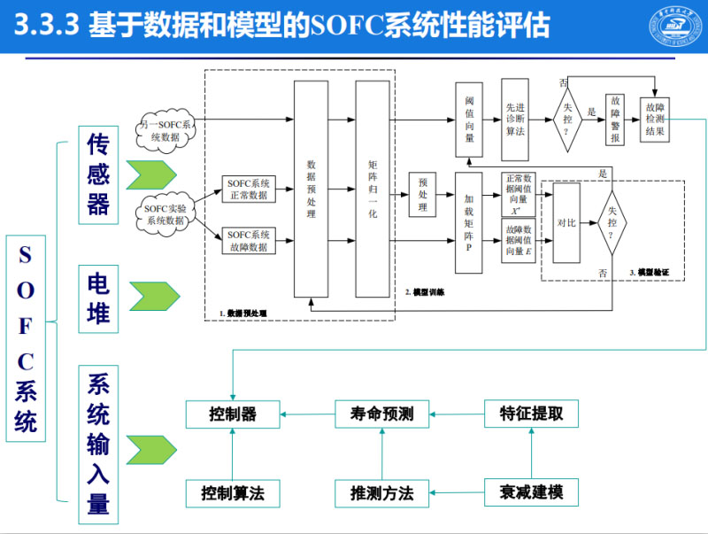 具體怎么分析,怎么評(píng)估和做出相應(yīng)的診斷?下面我介紹一下這一塊所開(kāi)展的工作。對(duì)一個(gè)系統(tǒng)級(jí)固體氧化物燃料電池發(fā)電系統(tǒng),這是它的結(jié)構(gòu)示意圖,一般分高溫區(qū)和低溫區(qū)。高溫區(qū)包括電堆、燃燒室、重整、換熱,低溫區(qū)一般包括有電控單元、傳感、儀表和風(fēng)機(jī)等。低溫區(qū)故障相對(duì)容易處理。高溫區(qū)處于600℃以上的環(huán)境,每一部件性能稍有損傷都會(huì)影響到整個(gè)系統(tǒng)品質(zhì)。針對(duì)高溫區(qū)部件具體所面臨的各類的問(wèn)題,比如性能是怎么衰減的、怎么規(guī)避、怎么延緩、怎么控制?我們主要圍繞了四個(gè)關(guān)鍵性容易發(fā)生故障的部件單元進(jìn)行分析——電堆、重整、換熱和燃燒?;诖罅肯到y(tǒng)發(fā)電測(cè)試分析,在上述冷區(qū)與熱區(qū)這幾個(gè)關(guān)鍵部分,針對(duì)其從正常工作到異常工作性能逐步衰減、發(fā)生故障的全過(guò)程,通過(guò)機(jī)理模型分析和數(shù)據(jù)驅(qū)動(dòng)建立了含各部件特性演變的模型。把正常、異常乃至故障的數(shù)據(jù)盡可能地和我們所搭建的模型去匹配,結(jié)果顯示模型分析預(yù)測(cè)結(jié)果與所建立的樣本數(shù)據(jù)還是比較接近的?;谠撓盗谢容^高的模型,才得以開(kāi)展下面的評(píng)估診斷和控制。