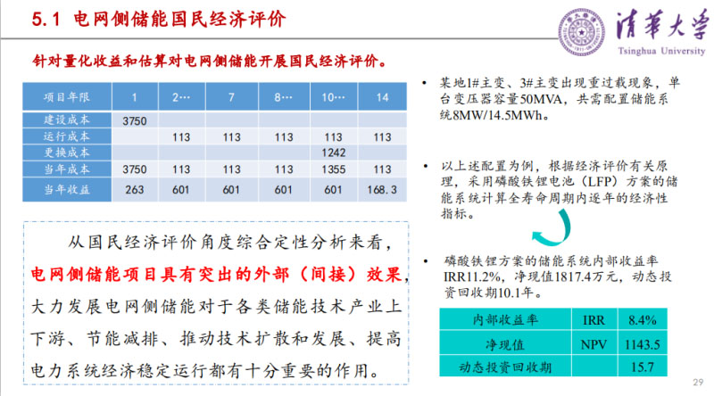 解決了這個總量的問題以后,就是實際上還要解決一個問題就是第三個,適用該地區(qū)的電站的標準化使用方案,220配置240這種的方案。我們現(xiàn)在在兩三個省找了一些地區(qū)做這個分析。另外簡單做了一個其實是一個電網(wǎng)側(cè)儲能的經(jīng)濟性分析,這個東西一直在做,不斷的深化,相對要做國民經(jīng)濟評價,因為我們知道儲能的發(fā)展,實際上很多效益是不體現(xiàn)在我們的收益里面的。為什么要去做國民經(jīng)濟評價呢?國民經(jīng)濟性好但是財務(wù)成本不夠好的話,國家會出很多相關(guān)的政策,同時這個政策根據(jù)發(fā)展的階段,還在不斷的變化。所以為什么我們一提政策,因為有很多的間接的效益包括關(guān)聯(lián)的產(chǎn)業(yè)還有效果,這個非常關(guān)鍵。為什么要給一塊錢的補貼,甚至很高的補貼,我認為國家會從別的行業(yè)拿錢補這個行業(yè)。這個研究就是用一些價格,用一些間接的東西來算。