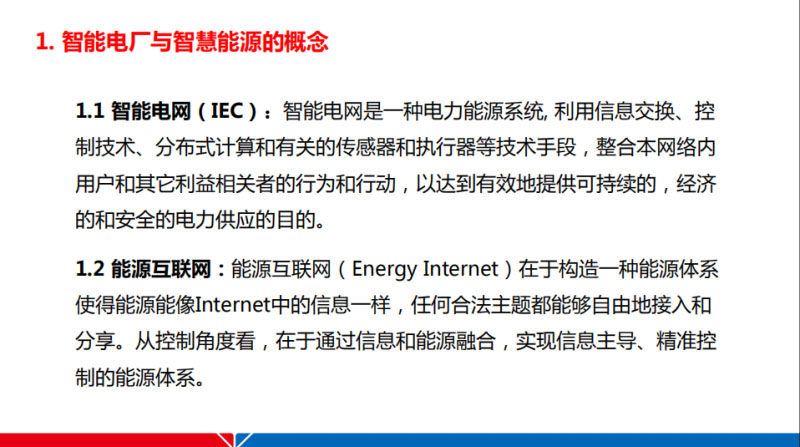 其實(shí)因?yàn)闀r(shí)間的關(guān)系,有些內(nèi)容不想太多說了,關(guān)于智能電網(wǎng)還有能源互聯(lián)網(wǎng)的定義網(wǎng)上有很多的研究院所還有高校的專家們都做過很多的探討,在這里面不想多說了想通過這個(gè)圖看一下,宏觀的能源互聯(lián)網(wǎng)和微觀的綜合能源,它有多大的一個(gè)區(qū)別呢?首先說這是IEC在2017年的時(shí)候關(guān)于智能電網(wǎng)還有工業(yè)設(shè)施的接口這個(gè)標(biāo)準(zhǔn)當(dāng)中給出的這么一個(gè)圖,左側(cè)是咱們典型的智能電網(wǎng),右側(cè)其實(shí)可以看成是一個(gè)微觀的綜合能源。在這里面呢,它這個(gè)藍(lán)色的線標(biāo)志的是信息流,紅色的線表示的是電流,我覺得總體來說還是比較清晰的。在這里面為什么提到智能電廠,實(shí)際上我們可以看到,在整個(gè)的能源互聯(lián)網(wǎng)鏈條當(dāng)中,智能發(fā)電無疑是最重要的一環(huán)。應(yīng)該說它都是處于智能電網(wǎng)也好能源互聯(lián)網(wǎng)的最前端,有一個(gè)關(guān)于智能電廠的定義,在這里面呢,說白了就是咱們在座的專家們也有可能是來自于咱們發(fā)電的行業(yè)。