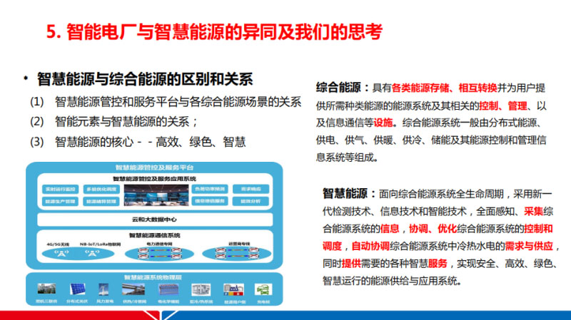 這個(gè)智能電廠事情說了十年的在這里面關(guān)于概念還有它的功能到底有哪些,在很多項(xiàng)目上面有爭議的在這里面關(guān)鍵的過程它是要協(xié)調(diào)優(yōu)化的發(fā)電廠的控制過程還有管理過程,自動適應(yīng)智能電網(wǎng)還有能源互聯(lián)網(wǎng)要求,核心點(diǎn)在這。下面應(yīng)該是我們對于智慧能源或者綜合能源的理解,應(yīng)該包括了不僅僅是電源,在這里面可能包括了電、氣、暖、冷、儲能。我們可以看到在綜合能源里面比較關(guān)注的設(shè)施的集成,而對于智慧能源想強(qiáng)調(diào)的就是在這里面的首先智慧能源一定面向綜合能源系統(tǒng)當(dāng)中全生命周期,信息技術(shù)和智能技術(shù)它去采集感知這些信息,然后它的關(guān)鍵點(diǎn)應(yīng)該還在于協(xié)調(diào)優(yōu)化這個(gè)綜合能源系統(tǒng)當(dāng)中的控制調(diào)度,自動協(xié)調(diào)供需的平衡,然后才是提供相應(yīng)的綜合能源的服務(wù),希望沒有本末倒置。