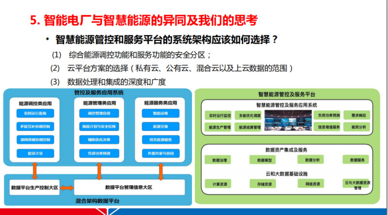 所以呢在這一塊包括像云,其實(shí)本意不是想說云本身,因?yàn)閷τ谠朴?jì)算云平臺也好大家都有特別多了解,我想說云的發(fā)展不管是為智能電廠還是智慧能源,一直都在帶來不斷的挑戰(zhàn),也就是說在做項(xiàng)目或者做方案的過程當(dāng)中,真的是要實(shí)時(shí)把握它的變化。前兩年在我們最開始做智能電廠的時(shí)候,那第一個(gè)反應(yīng)肯定不要做這個(gè)共有云,覺得如果有業(yè)主問我,我肯定會說私有云,因?yàn)楣灿性铺话踩?。但是?shí)際上互聯(lián)網(wǎng)這些供貨商他們也一直在去捕捉用戶的痛點(diǎn),然后他去提升。也就是說云技術(shù)發(fā)展到現(xiàn)在,對于智能能源服務(wù)平臺更多在采用一種混合云的結(jié)構(gòu)。