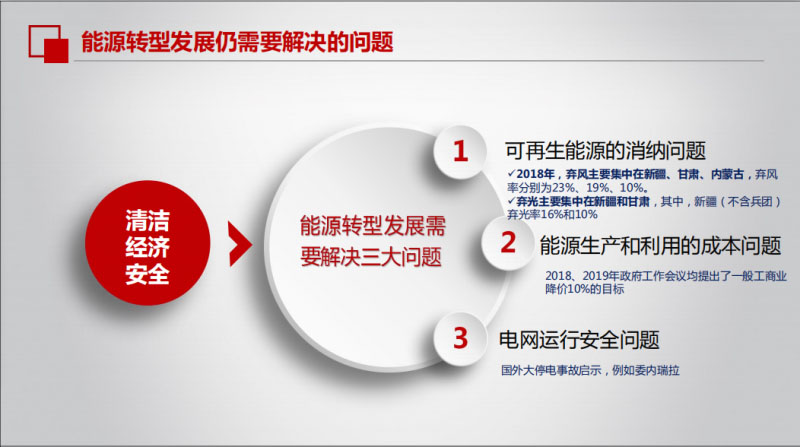 也有一些問題急需我們解決的,首先第一個(gè)就是可再生能源消納問題,覺得棄光棄風(fēng)現(xiàn)象比較嚴(yán)重的,新疆是達(dá)到了23%,甘肅達(dá)到了19%,另外像新疆甘肅的棄光比較嚴(yán)重,棄光率16%,甘肅是10%,這些都需要急需去解決的,第二個(gè)是能源生產(chǎn)還有利用成本的問題,總理提出來了把一般的工商業(yè)定價(jià)降價(jià)10%。第三個(gè)就是電網(wǎng)運(yùn)行安全的問題,我們國(guó)家在這方面表現(xiàn)的比較好,隨著越來越大規(guī)模的新能源的集中式的并網(wǎng)電力市場(chǎng)還有現(xiàn)貨市場(chǎng),對(duì)于電網(wǎng)安全運(yùn)行提出了一些新的挑戰(zhàn)的。引入社會(huì)資本創(chuàng)新能源投資及運(yùn)營(yíng)模式,能源互聯(lián)網(wǎng)是一種偏向于用戶側(cè)的這種能源生產(chǎn)能源利用形勢(shì),這樣可以降低電價(jià),對(duì)于降低用戶成本非常顯著的。