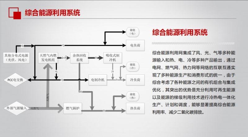 第二部分是我來介紹一下現(xiàn)階段這些能源互聯(lián)網(wǎng)的項(xiàng)目它落地的一些路徑,我們認(rèn)為綜合能源利用起來是一個(gè)重要的利用形勢(shì),要加速向綜合能源服務(wù)商轉(zhuǎn)型,這邊這個(gè)圖是簡(jiǎn)單能源流向圖,集成的外部的能源輸出,電網(wǎng)燃?xì)鉄崃W(wǎng)等網(wǎng)絡(luò)的互聯(lián)互通是實(shí)現(xiàn)多種能源生產(chǎn)還有消費(fèi)形式的統(tǒng)一??梢猿浞值睦每稍偕茉催M(jìn)行冷熱電它的一體化生產(chǎn)還有調(diào)度,可以顯著的提高整個(gè)系統(tǒng)的它的能源利用效率,減少二氧化碳排放。