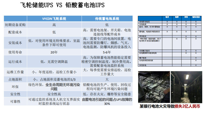 這個是飛輪儲能和鉛酸電池相比,從統(tǒng)計學(xué)的觀點來說,飛輪儲能系統(tǒng)做的UPS安全性是高于鉛酸電池的,大家可能覺得三元鋰不安全,甚至磷酸鐵鋰有時候也出問題,都覺得鉛酸夠安全了吧,實際鉛酸電池依然可能會發(fā)生一些事故,比如像左下角某個銀行的數(shù)據(jù)中心,由鉛酸電池做的UPS系統(tǒng)發(fā)生了火災(zāi),導(dǎo)致了2億人民幣的損失。