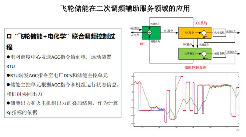 一次調(diào)頻當(dāng)它的頻率變動的時候,目前很多機(jī)組大家都很熟悉,自帶一次調(diào)頻能力,但是為了安全起見,為了機(jī)組的一體化,為了鍋爐穩(wěn)定運行,很多一次調(diào)頻信號是不響應(yīng)的,現(xiàn)在有一些區(qū)域的電網(wǎng)公司,他們對于你不響應(yīng)一次調(diào)頻信號是有罰款的,如果我們能配上飛輪儲能。大家可以看到,頻率的變化是綠色這條線,突然跌落就需要我們的輸出功率來增加,最后達(dá)到頻率的平衡。深藍(lán)色的這條線是我們實際的處理,就是沒有配套飛輪儲能系統(tǒng)的時候的處理情況,這個是不達(dá)標(biāo)的。如果我們配套了一定量的飛輪儲能系統(tǒng),可以達(dá)到虛線的紫色線的情況,就達(dá)到了電網(wǎng)一次調(diào)頻各項參數(shù)的考核,就不會再罰款了。
