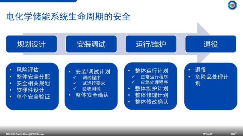 儲能系統(tǒng)風險管理應該在全生命周期管控,而不是說我安裝完一后管控他它的風險。風險包括規(guī)劃設計階段,比如說規(guī)劃設計階段我的設備制造商要去做本身產(chǎn)品的風險評估,我要知道哪些風險會存在,比如我過充、過放、過溫的時候我的產(chǎn)品風險來源是什么、我的風險概率是多少、我造成的后果有多大,比如風險出來了,我要做整體安全的分配。還有安全相關的規(guī)劃,比如每個器件、每個子系統(tǒng)怎么去規(guī)劃的,還有軟硬件實際的設計,設計完之后對單個功能或者單個安全的認證。安裝調試階段,包括我們要編制一些安裝調試計劃來保證我們系統(tǒng)的安全調試或者安全運行,包括調試程序,還有試運行的一些要求、驗收的一些措施。安裝完之后對整體安全確認的過程。運行、維護階段,運行之后5年、10年有一個整體運行計劃的編制,比如他的正常運行的程序,還有應急處理這些程序,還有整體的一些維護計劃、整體的優(yōu)秀計劃,整體修改的確認。退役階段,包括它的電池如何去做退役,還有危險品的處理計劃。