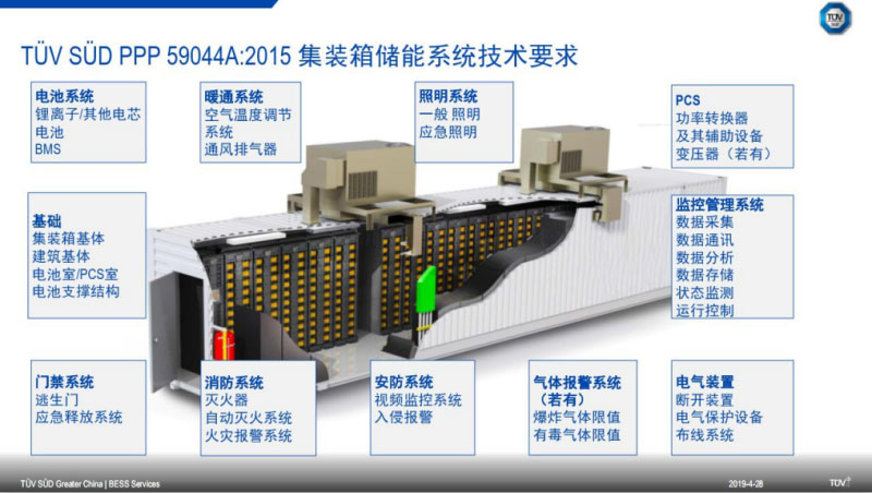 對整個文件和審核階段,包括以上所有的文件我們都會進行審核,包括一些集裝箱、PCS、電池等等文件的審核,還有現(xiàn)在結構的一些檢查,包括安裝結構、部件結構、照明的檢查。現(xiàn)場測試,包括一些氣密性測試、絕緣測試、耐壓測試、相序測試等等。整個PPP59044做完之后,結構和驗證做完之后我們就會發(fā)TUV的證書,前天我們在這個廳里面發(fā)了1兆瓦時的鵬輝的證書,之前中天的證書已經(jīng)拿到。我們產(chǎn)品包括電池的一些措施,就不再講了。