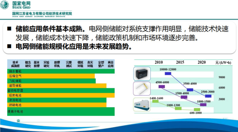 儲(chǔ)能為什么在這個(gè)時(shí)間點(diǎn)開(kāi)始推廣應(yīng)用??jī)?chǔ)能發(fā)展了很多年,從2010年之前就開(kāi)始在研究。但實(shí)際上,最關(guān)鍵的成本問(wèn)題,儲(chǔ)能要在電力系統(tǒng)里應(yīng)用的問(wèn)題,成本只有低到了一定階段才具備商業(yè)化的可能,電網(wǎng)里面用的時(shí)候也是一樣的,在這樣的背景下他能否替代我們傳統(tǒng)的一些電力設(shè)施來(lái)保證和優(yōu)化我們電網(wǎng)的發(fā)展,儲(chǔ)能的成本下降給我們?cè)陔娋W(wǎng)側(cè)的應(yīng)用創(chuàng)造了條件。從產(chǎn)業(yè)鏈來(lái)講,無(wú)關(guān)是從國(guó)家五部委還是江蘇省能源局,其實(shí)都有產(chǎn)業(yè)推動(dòng)的一些需要,也印發(fā)了大量的政策措施來(lái)推動(dòng),主要標(biāo)志還是2017年國(guó)家能源局的文件推動(dòng)。從江蘇電力公司來(lái)講,從我們建設(shè)電網(wǎng)主要是服務(wù)于電網(wǎng)安全,目前我們已經(jīng)做了一個(gè)大規(guī)模源、網(wǎng)、荷的友好互動(dòng)系統(tǒng),但是友好互動(dòng)系統(tǒng)的資源在哪里?以前我們?cè)谟脩羯厦嫒フ?,這個(gè)經(jīng)濟(jì)可用的用戶側(cè)資源其實(shí)是有限的,而且比較分散,在此基礎(chǔ)之上需要通過(guò)儲(chǔ)能來(lái)對(duì)可調(diào)控資源進(jìn)行補(bǔ)充。通過(guò)儲(chǔ)能的應(yīng)用,可以提升我們電網(wǎng)的瞬時(shí)、短時(shí)和時(shí)段三個(gè)能力,來(lái)提高電力系統(tǒng)的安全水平。同時(shí),為推動(dòng)儲(chǔ)能的應(yīng)用,江蘇公司內(nèi)部充分調(diào)動(dòng)資源,協(xié)調(diào)公司相關(guān)部門(mén)按照職責(zé)分工都來(lái)參與儲(chǔ)能應(yīng)用的研究。
