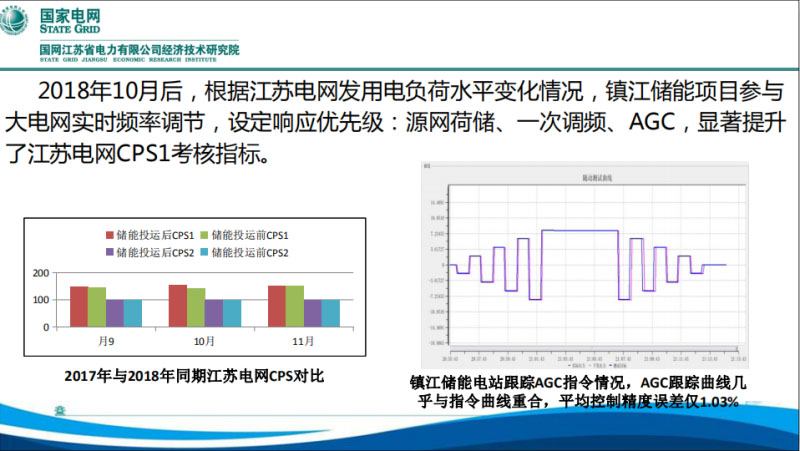夏季高峰以后,其他的時(shí)段怎么運(yùn)行呢。電網(wǎng)側(cè)儲(chǔ)能的運(yùn)行設(shè)了優(yōu)先級(jí),第一級(jí),就是前面介紹過(guò)的,納入到源、網(wǎng)、荷、儲(chǔ)事故應(yīng)急響應(yīng),這個(gè)是最快的,也是優(yōu)先級(jí)最高的。第二級(jí),就是一次調(diào)頻,就是說(shuō)電網(wǎng)在響應(yīng)頻率下降的時(shí)候,電網(wǎng)本身的一次調(diào)頻能力不足,通過(guò)儲(chǔ)能電站來(lái)響應(yīng)一次調(diào)頻的功能,這個(gè)作用對(duì)電網(wǎng)的支撐是非常有效的。在之后才是納入我們的AGC,通過(guò)儲(chǔ)能電站參與電網(wǎng)的頻率調(diào)節(jié)以后,讓他響應(yīng)ACE的信號(hào)進(jìn)行控制,對(duì)我們CPS指標(biāo)的考核其實(shí)是非常有好處的。下面做了一些CPS指標(biāo)的對(duì)比,效果是比較明顯的。