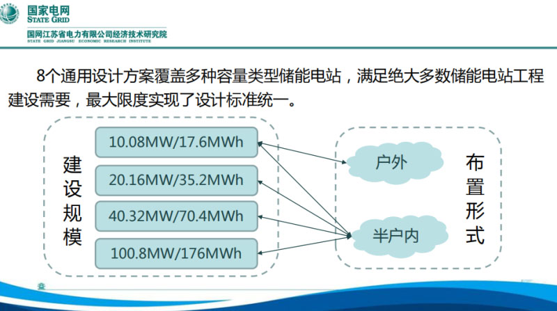 在鎮(zhèn)江儲(chǔ)能電站實(shí)踐的基礎(chǔ)上,通過(guò)總結(jié)在調(diào)試、運(yùn)行階段存在的問(wèn)題,提出了優(yōu)化方案。編制《儲(chǔ)能電站關(guān)鍵設(shè)備技術(shù)規(guī)范》,這個(gè)《規(guī)范》就是針對(duì)一些關(guān)鍵設(shè)備,主要是變流器、儲(chǔ)能電池、監(jiān)控系統(tǒng)等等進(jìn)行規(guī)范,確保儲(chǔ)能電站與電網(wǎng)協(xié)調(diào)運(yùn)行。還編制了《江蘇省電網(wǎng)儲(chǔ)能電站模塊化典型設(shè)計(jì)方案》,希望通過(guò)模塊化的設(shè)計(jì),在新的儲(chǔ)能電站可以更簡(jiǎn)單、快速的應(yīng)用。對(duì)電站進(jìn)行優(yōu)化升級(jí),主要提升三個(gè)方面:綜合性能、選型標(biāo)準(zhǔn)、優(yōu)化設(shè)計(jì)。編制的技術(shù)規(guī)范書(shū),通過(guò)了外部專家評(píng)審,典型方案則根據(jù)工程規(guī)模、應(yīng)用形式,分別設(shè)計(jì)典型應(yīng)用方案。典型設(shè)計(jì)包括了八個(gè)方案,按照儲(chǔ)能電站功率包括了1萬(wàn)、2萬(wàn)、4萬(wàn)和10萬(wàn)千瓦,配電裝置形式有戶外的、有半戶內(nèi)的,設(shè)置這樣的模塊基本上能夠滿足大部分工程建設(shè)的需要。