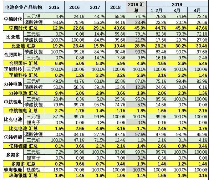 寧德時代的三元里的產(chǎn)量占比在快速提升中。尤其是寧德時代為代表2018年的三元鋰占比自身總量達(dá)到56%,2019年4月達(dá)到自身73%的比例。