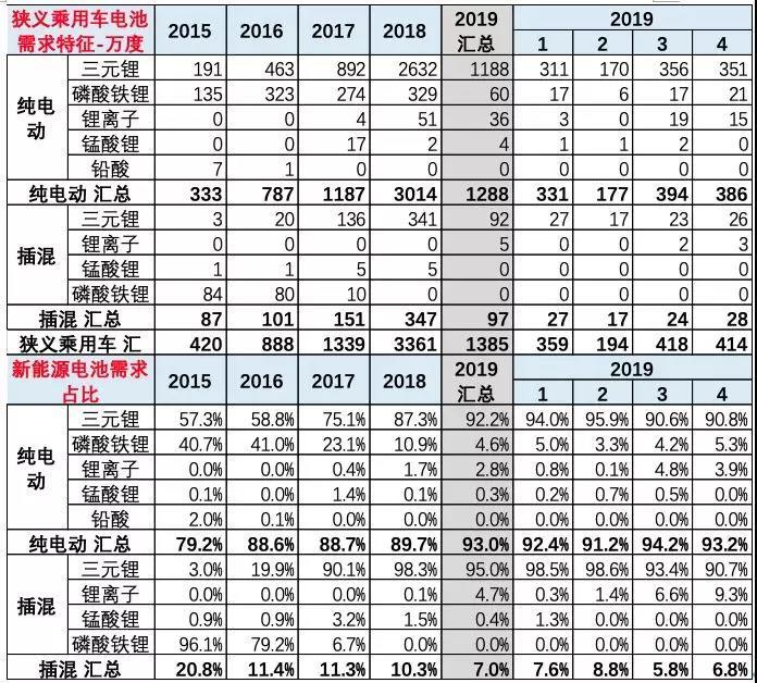 此表是狹義乘用車的電池需求特征。近幾年的國產(chǎn)新能源乘用車的產(chǎn)品性能提升很快,其中三元電池的占比提升促進(jìn)乘用車的產(chǎn)品技術(shù)提升。