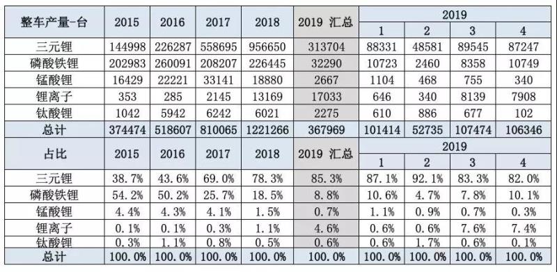 以上數(shù)據(jù)為2016-2019年的數(shù)據(jù),2018年是122萬臺,三元鋰的占比從69%上升到78%。