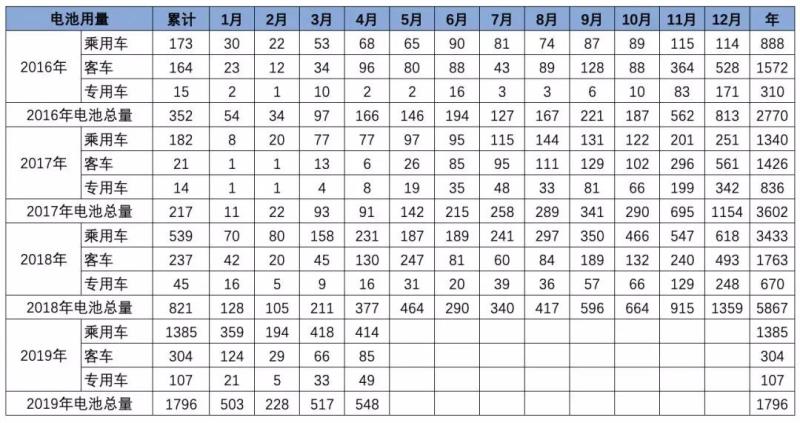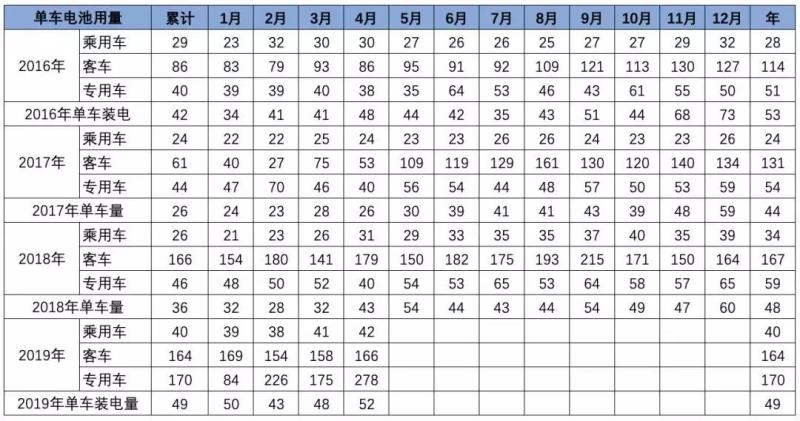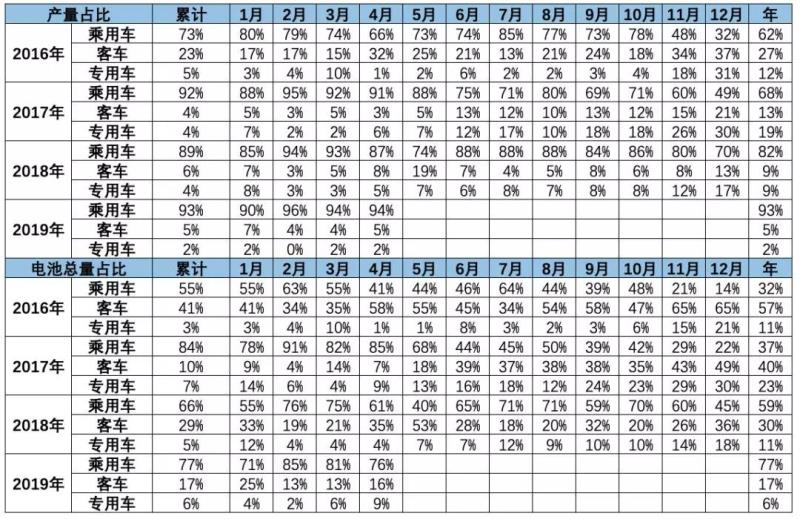 2019年4月的乘用車總體占產(chǎn)量需求的94%和電池需求的76%,仍是引領(lǐng)消費增長的核心動力。