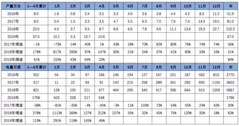 2019年1-4月的新能源車爆發(fā)增長到37萬輛,同比增速61%。電池增長到1796萬度,同比增長119%,2019年1—4月的開局超強(qiáng)。