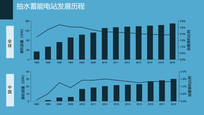 第二個,抽水蓄能電站這一塊,我們選擇比較合適的地形,建一個上水庫、下水庫,高峰的時候把上水庫的水發(fā)到下水庫來,發(fā)電原理比較簡單。右邊是已建的一些抽水蓄能電站的工程圖片。中間那張有上水庫和下水庫的就是浙江省在安吉的天荒坪抽水蓄能電站,也是我們華東地區(qū)已建的最大一個抽水蓄能電站。抽水蓄能電站在全世界范圍以內最早發(fā)源于瑞士,那是1882年。歐洲發(fā)展之后迅速轉到美國和日本。近十年建設的重心轉到了亞洲,尤其是中國。到目前為止,全球的抽水蓄能電站總裝機達到167GW。全球裝機比重層面來看,2016年的數(shù)據(jù),抽水蓄能裝機比重達到全球總裝機的2.4%。中國2018年底已建的抽水蓄能電站是30GW,占的比重是1.6%左右,大概是這么一個規(guī)模。相比世界水平來講,目前抽水蓄能電站的比重還是略顯低一點,還有很大的發(fā)展空間。當然,這也不僅僅直接是一個裝機容量的配比關系。中國的發(fā)展情況目前主要集中在沿海的發(fā)達地區(qū)像華東、華北,另外還有東北、華中地區(qū)。目前2018年底建成了30GW,在建44GW。規(guī)劃到2025年,是90GW,占總裝機規(guī)模3.5%左右。截至2018年底,中國建成的抽水蓄能電站總裝機規(guī)模在世界上排列第一。