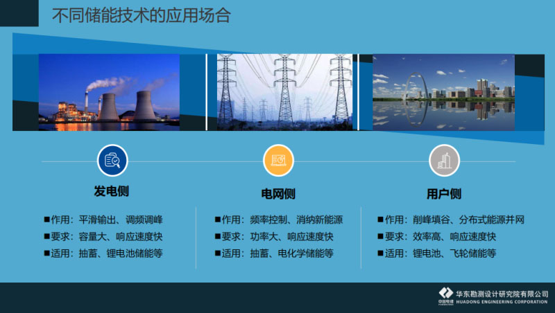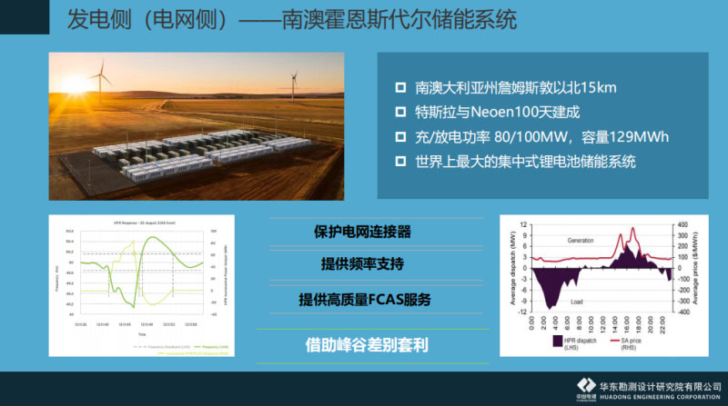 在其他儲能技術的綜合應用這一塊,各個儲能之間的比較,剛剛劉總已經(jīng)介紹得很詳細。抽水蓄能電站跟其他的儲能設施不是競爭關系,而是各有優(yōu)缺點會適應不同的場景,很多情況下是互補的狀況?,F(xiàn)在做抽水蓄能電站設計的時候,也要考慮到抽水蓄能電站本身是不是配置一些儲能設施。應用場景這一塊,分發(fā)電側、電網(wǎng)側和用戶側。案例這一塊,針對離網(wǎng)型華東院主要實踐的是東部的沿海地區(qū)。我們建立了一個由風機、光伏發(fā)電還有海水淡化以及蓄能電池組成的微網(wǎng)系統(tǒng)。國外也有一個,離網(wǎng)型的電網(wǎng)系統(tǒng),是澳大利亞弗林德斯島的微電網(wǎng)。后來因為對環(huán)保的要求后續(xù)投入了風電、光伏包括飛輪儲能等,還有電阻。柴油發(fā)電機變成了備用電站,少量地帶一個基荷。整體看下來,這個項目的盈利性不是唯一考慮的因素,主要還是保障居民的用電以及能用得更好。整個系統(tǒng)的負荷是遠超本身居民用電的需求。運行自動化程度和美觀度是非常好的。有興趣的可以去考察一下。