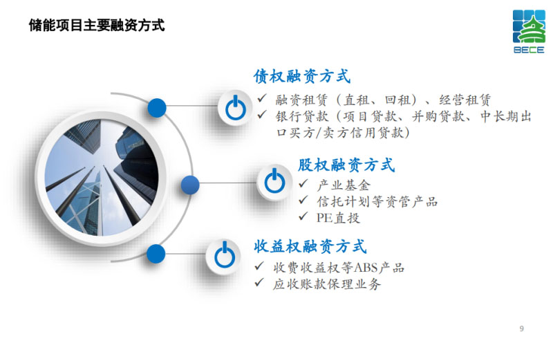 下面分享一下儲(chǔ)能項(xiàng)目的融資方式。因?yàn)槲冶旧硪彩窃诮鹑跈C(jī)構(gòu)做了很多年,對(duì)金融機(jī)構(gòu)業(yè)務(wù)模式有一些心得,此部分也跟大家做下重點(diǎn)分享。儲(chǔ)能項(xiàng)目現(xiàn)在主要的融資模式主要分三個(gè)方式:一個(gè)是債權(quán)融資方式,包括融資租賃、經(jīng)營(yíng)租賃、銀行貸款、項(xiàng)目貸款、并購(gòu)貸款、中長(zhǎng)期出口賣方買方的信用貸款等。第二種就是股權(quán)融資方式,包括產(chǎn)業(yè)基金、信托計(jì)劃包括一些PE直投等。再有就是收益權(quán)融資方式,包括收費(fèi)收益權(quán)的ABS產(chǎn)品或者應(yīng)收賬款的保理等。