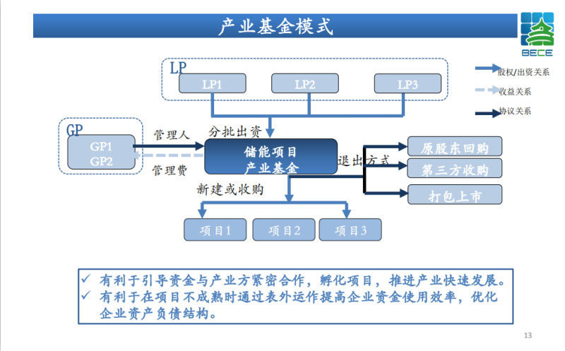 下面說(shuō)一下股權(quán)類的融資。我們目前做的幾個(gè)基金類產(chǎn)品都是趨于股權(quán)類融資。目前我們和政府或者是儲(chǔ)能行業(yè)的企業(yè)方合作,成立了一些政府引導(dǎo)基金和產(chǎn)業(yè)基金?;鸬暮锰幘褪窃陧?xiàng)目不成熟的時(shí)候,可以通過(guò)表外運(yùn)作提高企業(yè)的資金使用效率,優(yōu)化企業(yè)的資產(chǎn)負(fù)債率。相當(dāng)于在企業(yè)的體外去做這個(gè)事情,也不會(huì)增加你整個(gè)企業(yè)的負(fù)債率的水平。同時(shí)還把項(xiàng)目建起來(lái),這是基金的好處。