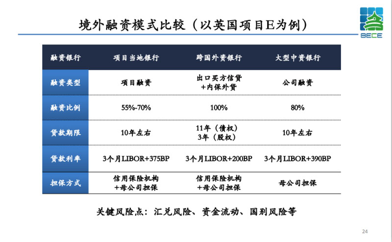 下面簡(jiǎn)要說(shuō)一下我們?cè)诰惩獾膸讉€(gè)項(xiàng)目。這是在英國(guó)北部建的一個(gè)120MWh的項(xiàng)目。主要是用買方信貸模式,基本上是全融資。融資銀行也是幾家銀行聯(lián)合,像渣打、國(guó)開(kāi)行、蘇格蘭皇家銀行、桑坦德銀行,額度4200萬(wàn)英鎊。這是在澳大利亞的一個(gè)調(diào)頻調(diào)峰的項(xiàng)目,也是通過(guò)項(xiàng)目融資的模式,聯(lián)合了星展、國(guó)開(kāi)行、澳洲國(guó)民銀行來(lái)做的項(xiàng)目,也是通過(guò)買方信貸的模式。還有在加拿大安大略省,運(yùn)用產(chǎn)業(yè)基金模式,目前集團(tuán)在加拿大與美國(guó)、養(yǎng)老基金共同發(fā)起設(shè)立海外儲(chǔ)能產(chǎn)業(yè)基金,收購(gòu)目標(biāo)公司股份,并進(jìn)行相關(guān)運(yùn)維管理。這是剛才的幾個(gè)項(xiàng)目融資模式的簡(jiǎn)要對(duì)比。這是境外機(jī)構(gòu)的一個(gè)融資模式的對(duì)比。