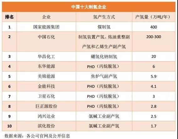 同時(shí),在化工工業(yè)副產(chǎn)氫方面,無論是焦?fàn)t氣副產(chǎn)氫氣、氯堿工業(yè)副產(chǎn)氫氣還是丙烷脫氫副產(chǎn)氫氣,涉及到的企業(yè)更是多達(dá)百家,因此本文中的中國(guó)十大制氫企業(yè),在設(shè)定標(biāo)準(zhǔn)時(shí),需同時(shí)滿足本身有穩(wěn)定的氫氣產(chǎn)能和已布局(或?qū)⒁季郑淙剂想姵禺a(chǎn)業(yè)兩個(gè)條件,排名順序根據(jù)企業(yè)的制氫量為標(biāo)準(zhǔn)。下表為中國(guó)十大制氫企業(yè)(按照制氫量進(jìn)行排名)。