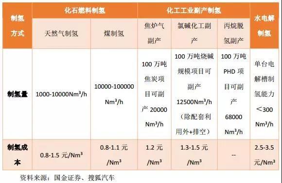 因此未來短時(shí)間內(nèi)我國(guó)氫能產(chǎn)業(yè)發(fā)展的氫源主要將來自化石燃料制氫(煤制氫)和化工工業(yè)副產(chǎn)氫(焦?fàn)t氣副產(chǎn)氫、氯堿副產(chǎn)、PDH即丙烷脫氫副產(chǎn)等)。下表為各種制氫方式的制氫規(guī)模以及成本。