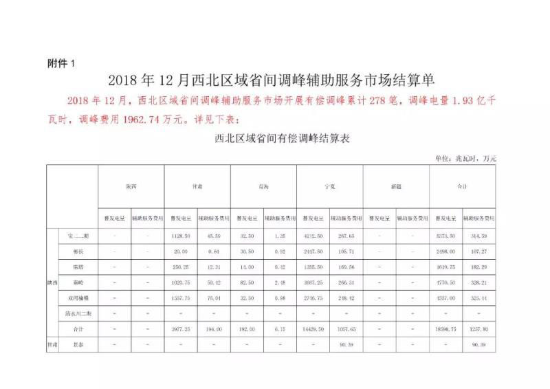 2018年12月,西北區(qū)域省間調(diào)峰輔助服務(wù)市場開展有償調(diào)峰累計278筆,調(diào)峰電量1.93億千瓦時,調(diào)峰費用1962.74萬元;