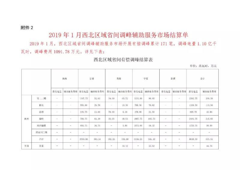 2019年1月,西北區(qū)域省間調(diào)峰輔助服務(wù)市場開展有償調(diào)峰累計171筆,調(diào)峰電量1.10億千瓦時,調(diào)峰費用1091.78萬元;