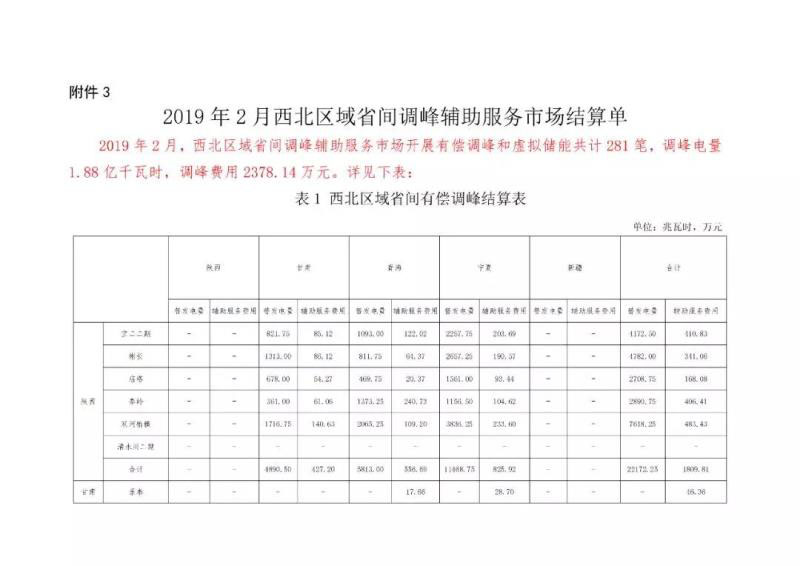 2019年2月,西北區(qū)域省間調(diào)峰輔助服務(wù)市場開展有償調(diào)峰和虛擬儲能共計281筆,調(diào)峰電量1.88億千瓦時,調(diào)峰費用2378.14萬元;