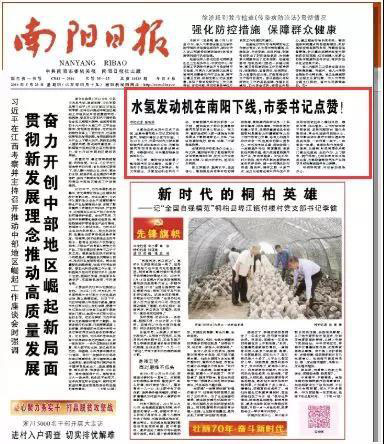 5月23日,南陽日?qǐng)?bào)頭版發(fā)文《水制氫發(fā)動(dòng)機(jī)正式下線,市委書記點(diǎn)贊!》,文章稱,水制氫發(fā)動(dòng)機(jī)在我市正式下線了,這意味著車載水可以實(shí)時(shí)制取氫氣,車輛只需加水即可行駛。