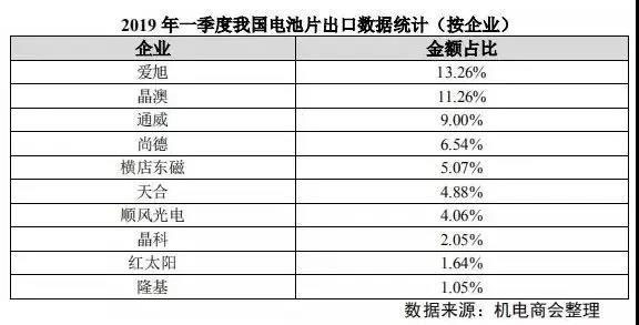 從出口企業(yè)看,2019 年一季度主要電池片出口額前五位企業(yè)分別是愛旭、晶澳、通威、尚德和橫店?yáng)|磁。前五位企業(yè)出口額占總出口額的 45%以上。