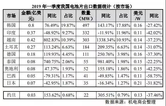 從出口市場(chǎng)看,2019 年一季度我國(guó)電池片出口前五位市場(chǎng)分別是韓國(guó)、印度、越南、土耳其和德國(guó)。韓國(guó)取代印度成為我國(guó)電池片出口第一大市場(chǎng),對(duì)韓國(guó)出口電池片金額 0.8 億美元,占總出口額的 19.87%;對(duì)韓國(guó)電池片出口數(shù)量為497MW,占比 17.88%。