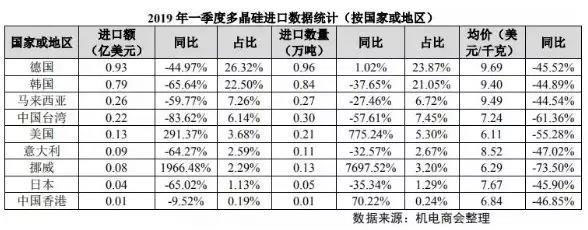 2018 年 11 月 1日起,對(duì)原產(chǎn)于歐盟的進(jìn)口太陽(yáng)能級(jí)多晶硅所適用的反傾銷措施和反補(bǔ)貼措施終止實(shí)施,受此影響,德國(guó)取代韓國(guó)成為中國(guó)第一大多晶硅進(jìn)口來(lái)源國(guó)地位,2019年一季度自德國(guó)進(jìn)口金額 0.93 億美元,占總進(jìn)口額的 26.32%,同比下降 44.97%;進(jìn)口數(shù)量 0.96 萬(wàn)噸,同比增長(zhǎng) 1.02%。