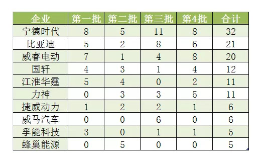從配套數(shù)量上來看,寧德時(shí)代32款的總配套數(shù)量穩(wěn)居第一,并且每一批配套數(shù)量均為第一(其中第四批與威睿電動并列第一) ,配套車型涉及面最廣,包括大眾、現(xiàn)代、北汽、吉利、菲亞特、奇瑞、長城、廣汽、奧迪、威馬、起亞、國能等國內(nèi)主流車企,“朋友圈”涵蓋半個車企圈果然不是說說而已。