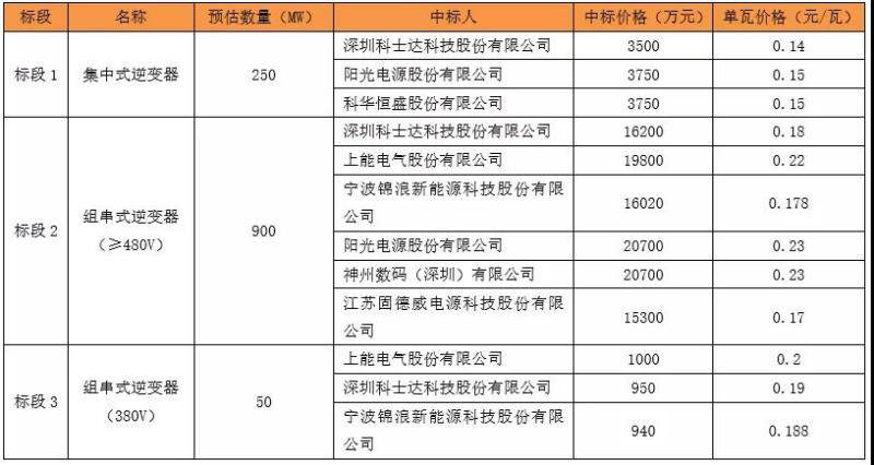 日前,中能建公示了該公司2019-2020年光伏逆變器集中采購項(xiàng)目定標(biāo)結(jié)果,科士達(dá)、陽光電源、科華恒盛、上能電氣、錦浪科技、固德威成功中標(biāo)。詳細(xì)中標(biāo)結(jié)果如下:
